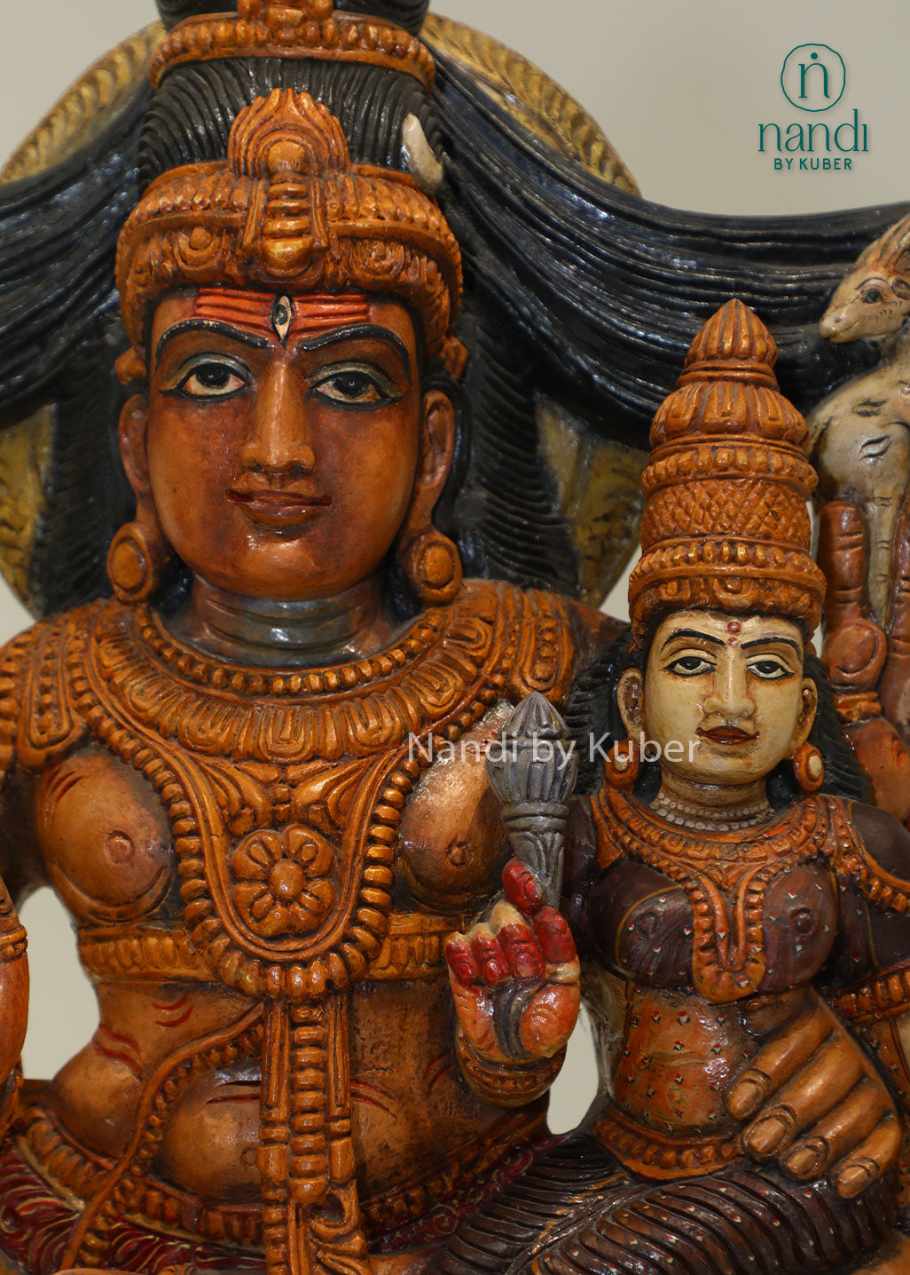 This majestic Wood Shiva Parvati With Nandi sculpture beautifully depicts the divine family, symbolizing harmony, devotion, and spiritual strength. Crafted with intricate detailing from premium wood, it captures the timeless essence of Shiv Parivar with grace and artistry. Perfect for sacred spaces, pooja rooms, or as a distinguished centerpiece, it brings both spiritual energy and aesthetic elegance to any home.