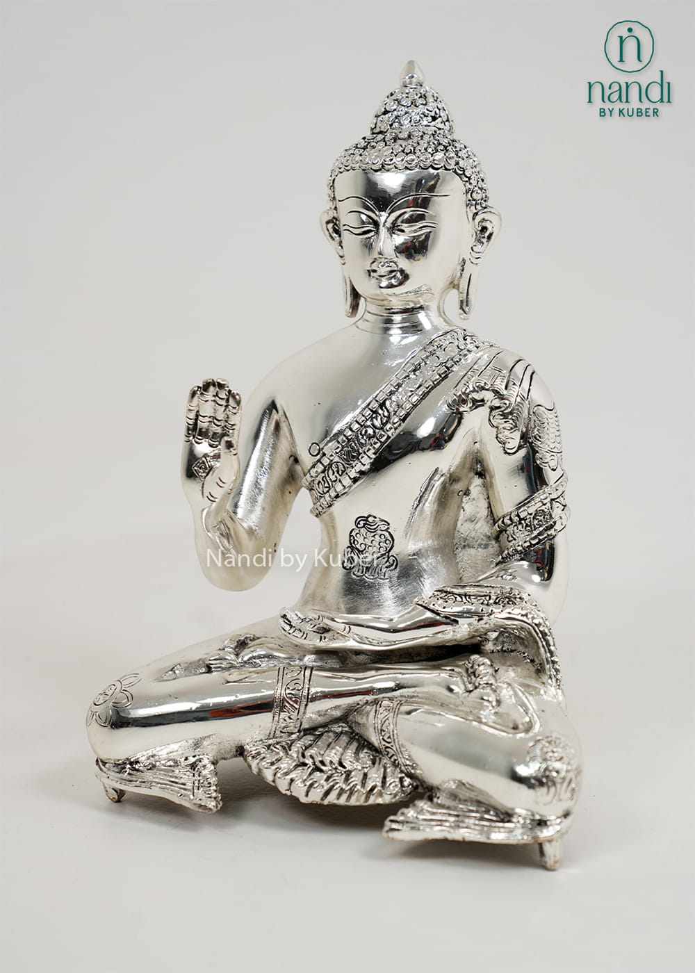 This handcrafted Brass Buddha Ashtamangala sculpture represents serenity and spiritual balance, symbolising the auspicious Ashtamangala elements. The refined silver-plated finish over brass enhances the detailing and gives the idol a premium devotional appeal, ideal for home temples and meditation spaces.