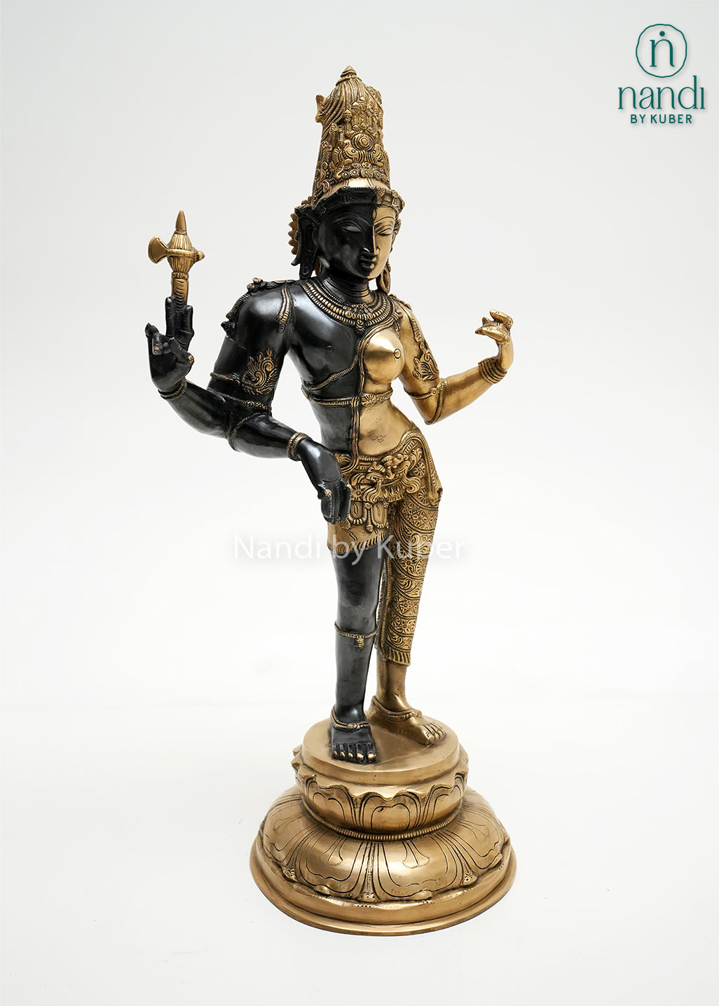 A divine representation of Shiva and Shakti as one, this Brass Ardhanarishwar sculpture features a premium black-green finish that enhances its sacred presence. Perfect for pooja rooms, spiritual corners, or as a centerpiece in curated divine décor.