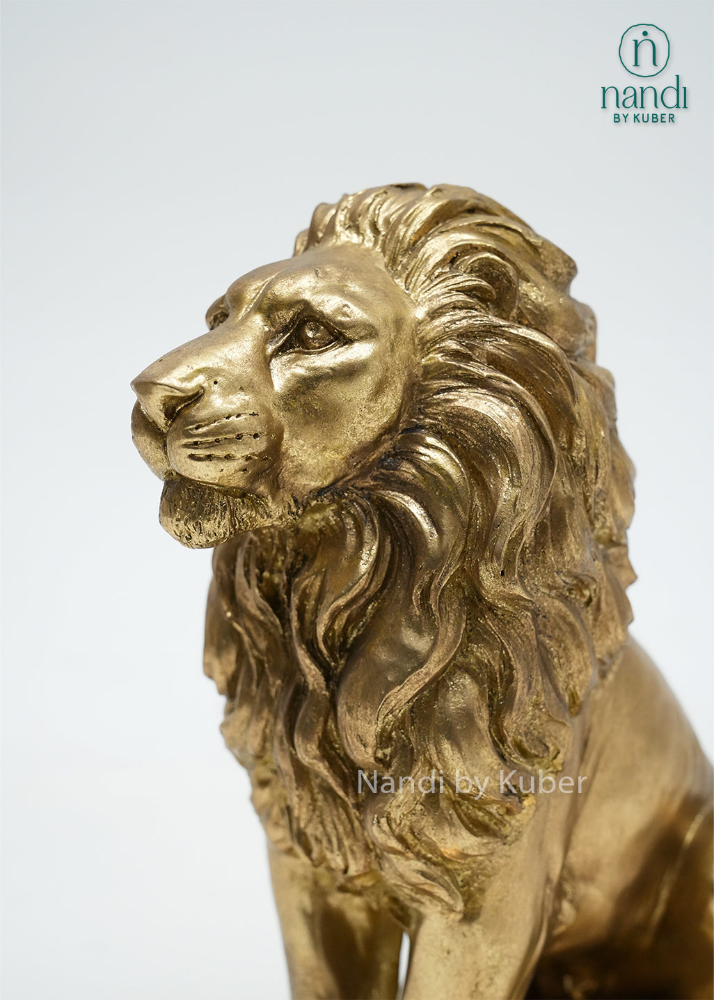 A striking decorative piece featuring a majestic lion sitting in a regal posture, finished in an elegant golden tone. Crafted with precision in high-quality resin, this sculpture adds a bold yet refined touch to any interior. Its detailed texture and glossy finish make it a standout décor element for modern, classic, or luxury spaces.