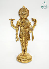 A sacred 15-inch Brass Dhanvantari Idol in Yellow-Gold finish, representing the divine physician and harbinger of health, healing, and prosperity.